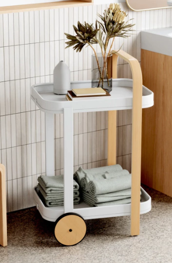 Um moderno carrinho de barra de madeira de dois tons, complemento perfeito para qualquer canto da sua casa. Crie sua própria configuração de bar em casa ou use Bellwood para fazer um carrinho de jardim interno ou mesa lateral.