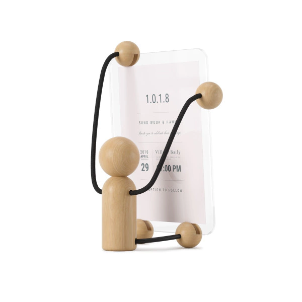 Um porta-retratos exclusivo sustentado por uma linda figura de madeira, o Woody flutua suas fotos entre dois painéis de vidro. A estatueta Woody funciona como um cavalete para a moldura, pois suas mãos e pés são usados para segurar os pedaços de vidro juntos.