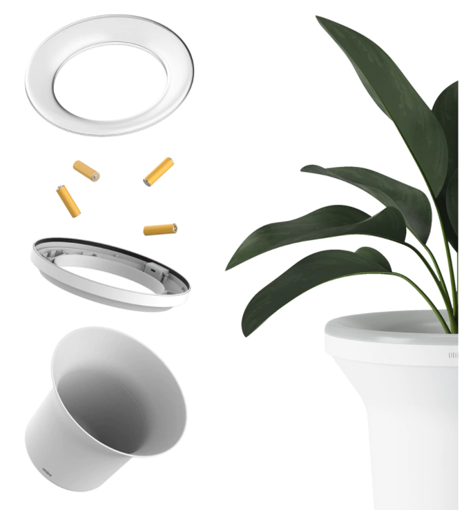 Suporte de planta iluminado com bateria e timer, alimentado por 4 pilhas AA (não incluídas) ou um cabo micro USB. Possui modo de configuração do temporizador sempre ligado e de 6 horas. Com botão liga e desliga.